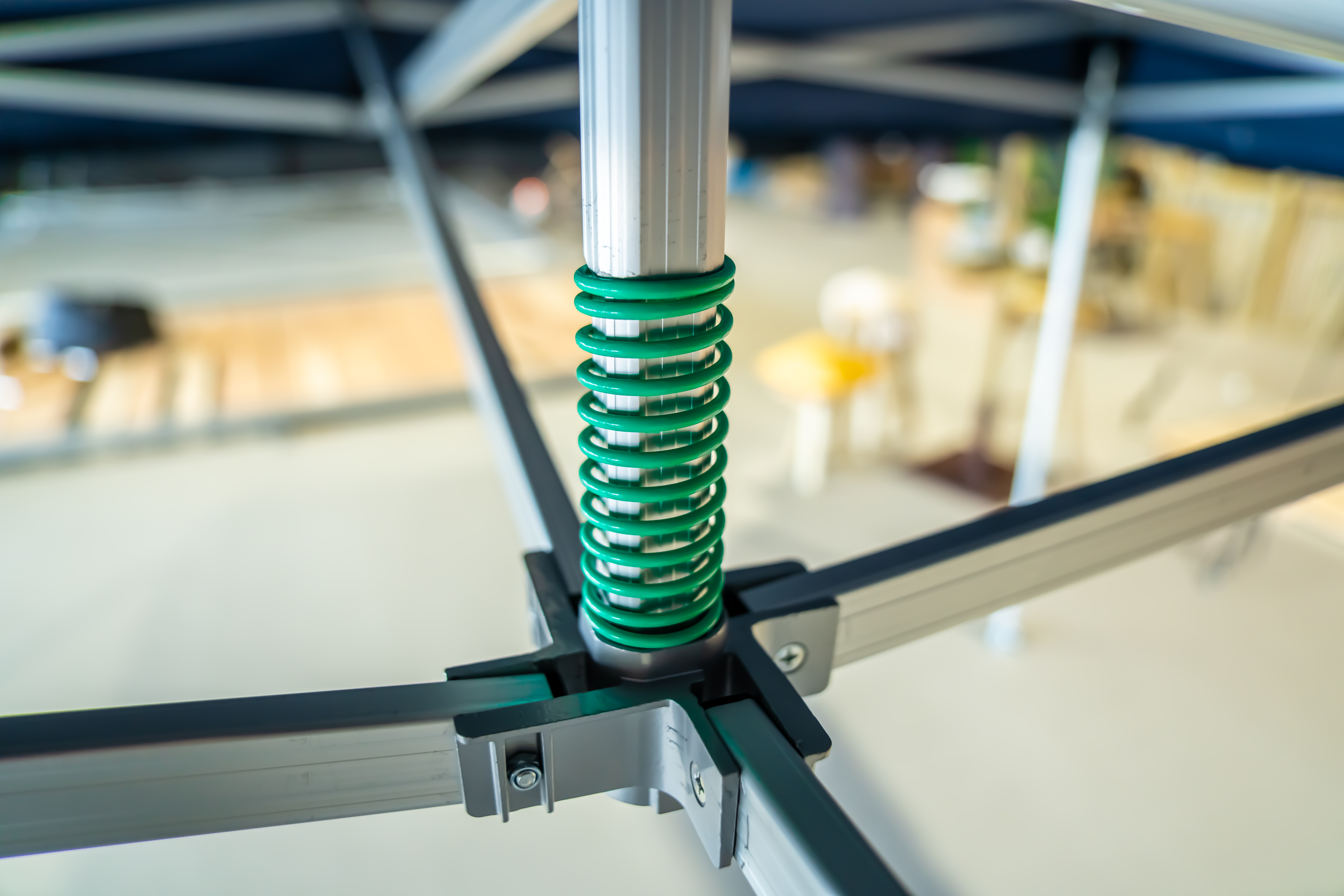 Dank der 10 x 10 cm großen Bodenplatten steht das Faltzelt jederzeit sicher auf seinen Beinen. Die markante grüne Feder in der Mitte der Dachkonstruktion der Faltzelte sorgt dafür, dass die Dachplane unter Spannung bleibt.