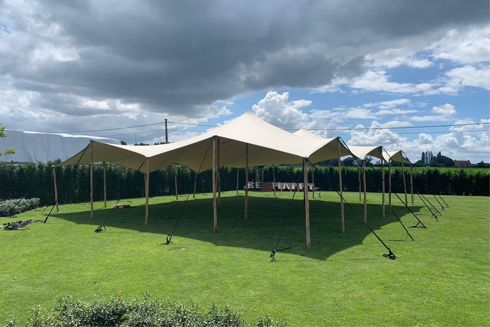 Geben Sie Ihrem Event, Ihrer Party, Ihrem Sommerbar, Ihrer Terrasse oder Ihrem Garten einen Hauch vom Sommer und Süden mit dem double coated Stretchzelt von 10 x 12,5 m, auch Nomadenzelt genannt. Dank der elastischen Plane und der umstellbaren Pfähle aus Aluminium oder sehr starkem Eukalyptusholz (Pfahlsets sind separat erhältlich) können Sie mit der Aufstellung des Zeltes spielen: bei schönem Wetter stellen Sie das Zelt mit vier offenen Seiten auf, bei Wind mit einer oder mehreren geschlossenen Seiten und bei Regen können Sie das Zelt fast ganz geschlossen aufstellen. Je größer das Zelt, umso mehr Möglichkeiten gibt es. Möchten Sie während des Events einen zusätzlichen Ein- oder Ausgang haben oder steht ein Seiten- oder Eckpfahl im Weg? Dann können Sie die Aufstellung des Zelts einfach während des Events anpassen.