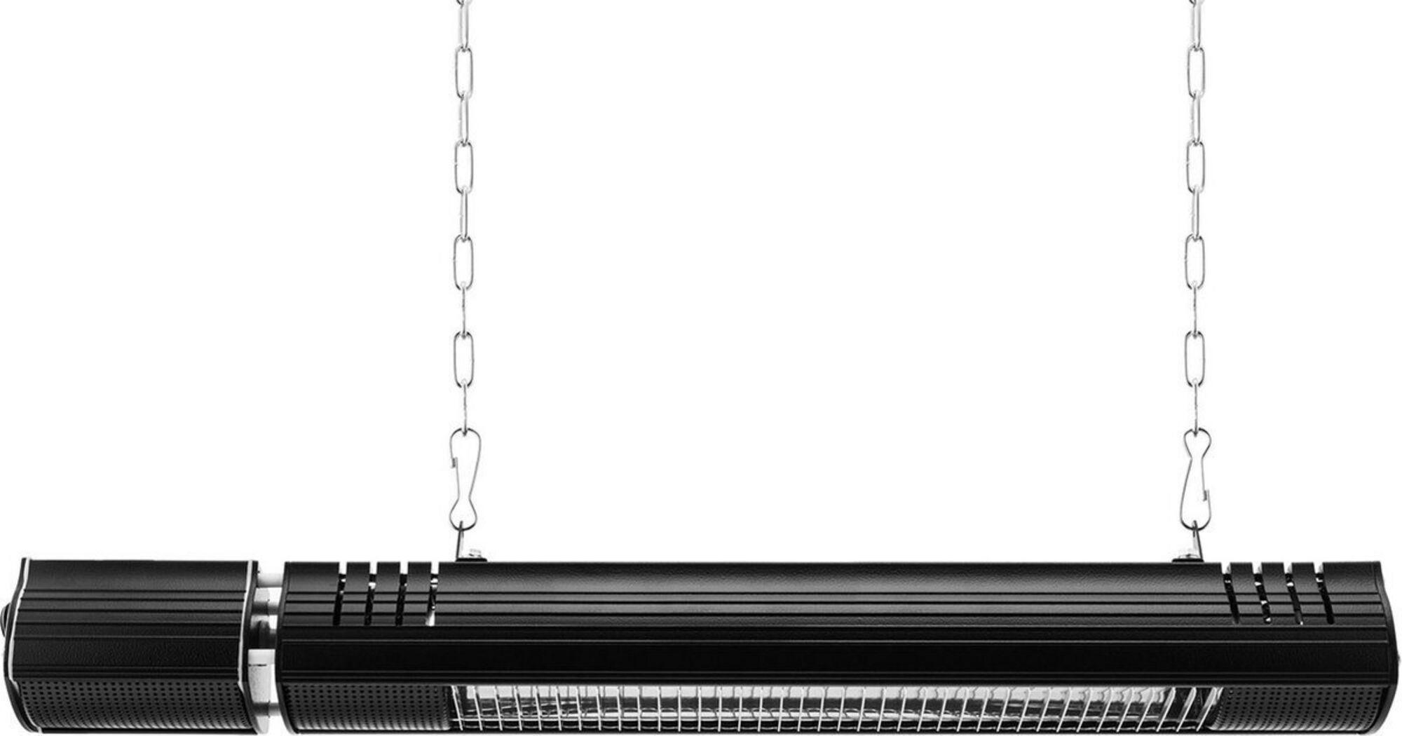 Dieser Wandheizer ist mit goldenen Infrarot-Halogenröhren ausgestattet, die eine Lebensdauer von 5000 bis 7000 Stunden haben. Das Gehäuse besteht aus schwarz pulverbeschichtetem Stahl. Das Gerät besitzt eine IP65-Zertifizierung, was bedeutet, dass es staub- und wasserbeständig ist. Der Infrarot-Terrassenheizer ist somit vollständig für den Außeneinsatz geeignet und kann auch Regen problemlos standhalten. Alle Montagezubehörteile (Schrauben, Halterungen und Kette) sind im Lieferumfang enthalten.