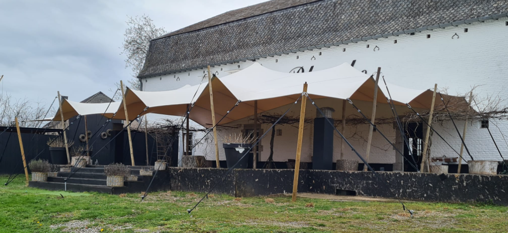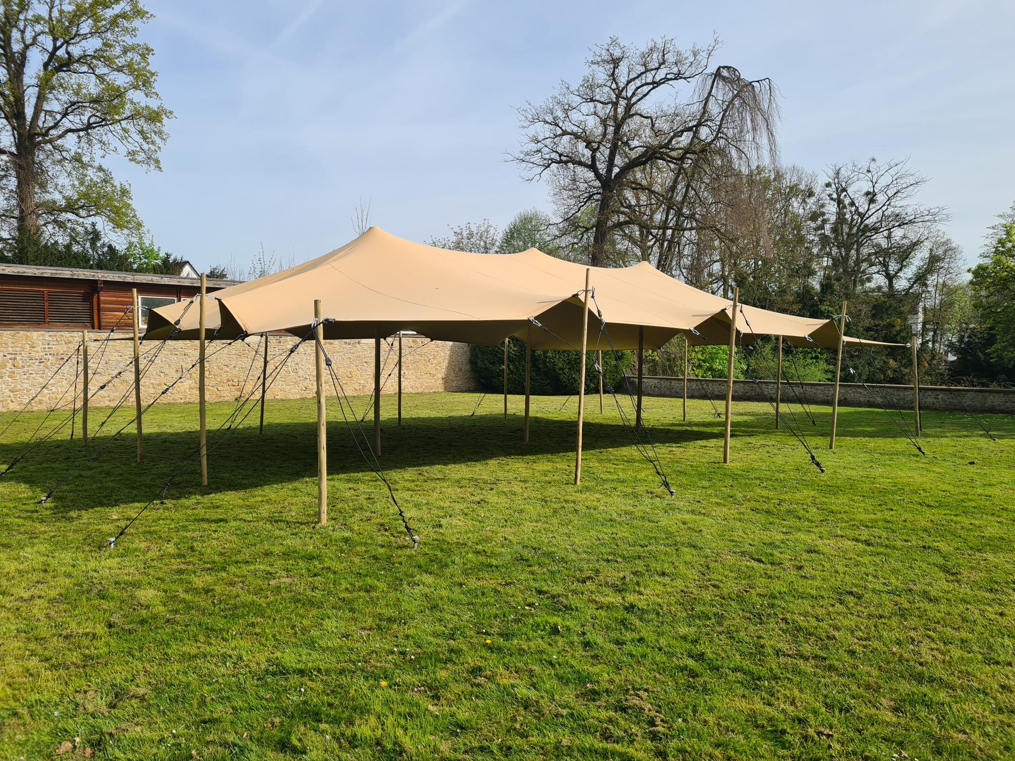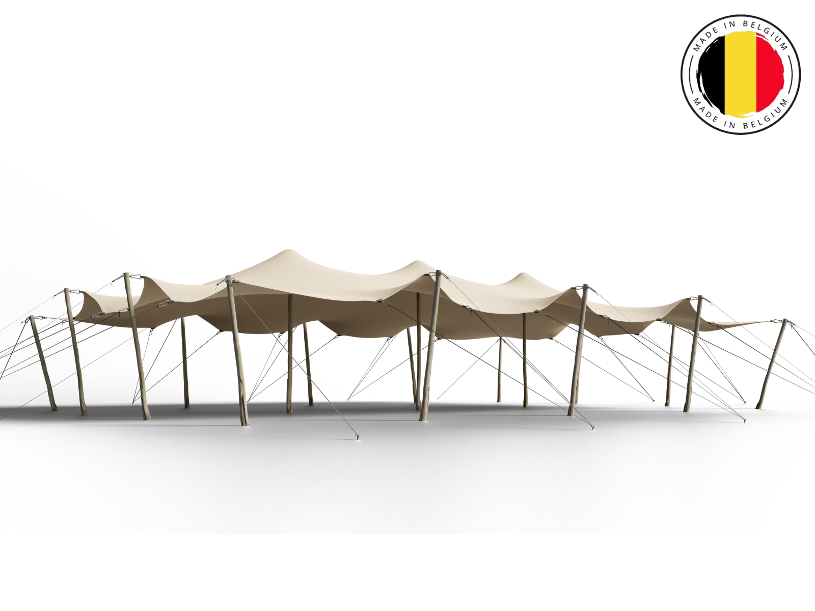 Geben Sie Ihrem Event, Ihrer Party, Ihrem Sommerbar, Ihrer Terrasse oder Ihrem Garten einen Hauch vom Sommer und Süden mit dem double coated Stretchzelt von 10 x 15 m, auch Nomadenzelt genannt. Dank der elastischen Plane und der umstellbaren Pfähle aus Aluminium oder sehr starkem Eukalyptusholz (Pfahlsets sind separat erhältlich) können Sie mit der Aufstellung des Zeltes spielen: bei schönem Wetter stellen Sie das Zelt mit vier offenen Seiten auf, bei Wind mit einer oder mehreren geschlossenen Seiten und bei Regen können Sie das Zelt fast ganz geschlossen aufstellen. Je größer das Zelt, umso mehr Möglichkeiten gibt es. Möchten Sie während des Events einen zusätzlichen Ein- oder Ausgang haben oder steht ein Seiten- oder Eckpfahl im Weg? Dann können Sie die Aufstellung des Zelts einfach während des Events anpassen.
