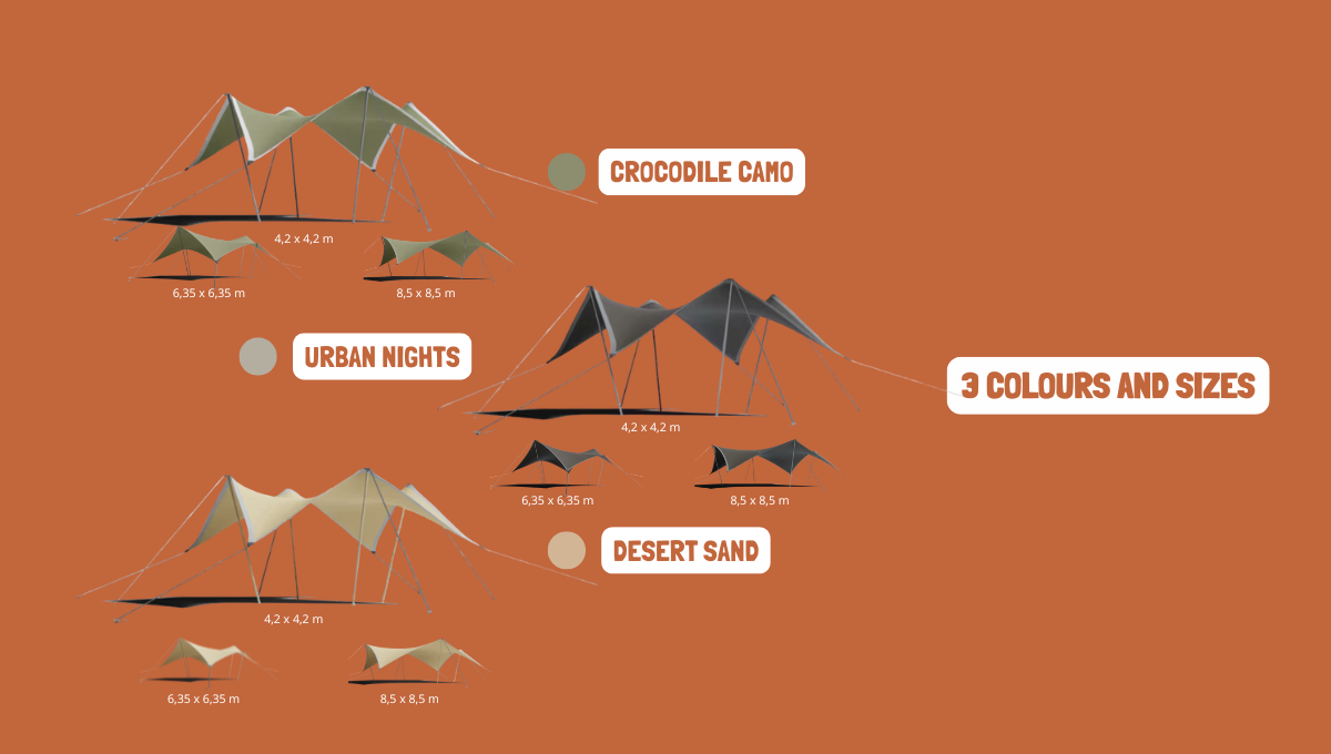 - 3 sizes: 4.2 x 4.2 m | 6.35 x 6.35 m | and 8.5 x 8.5 m