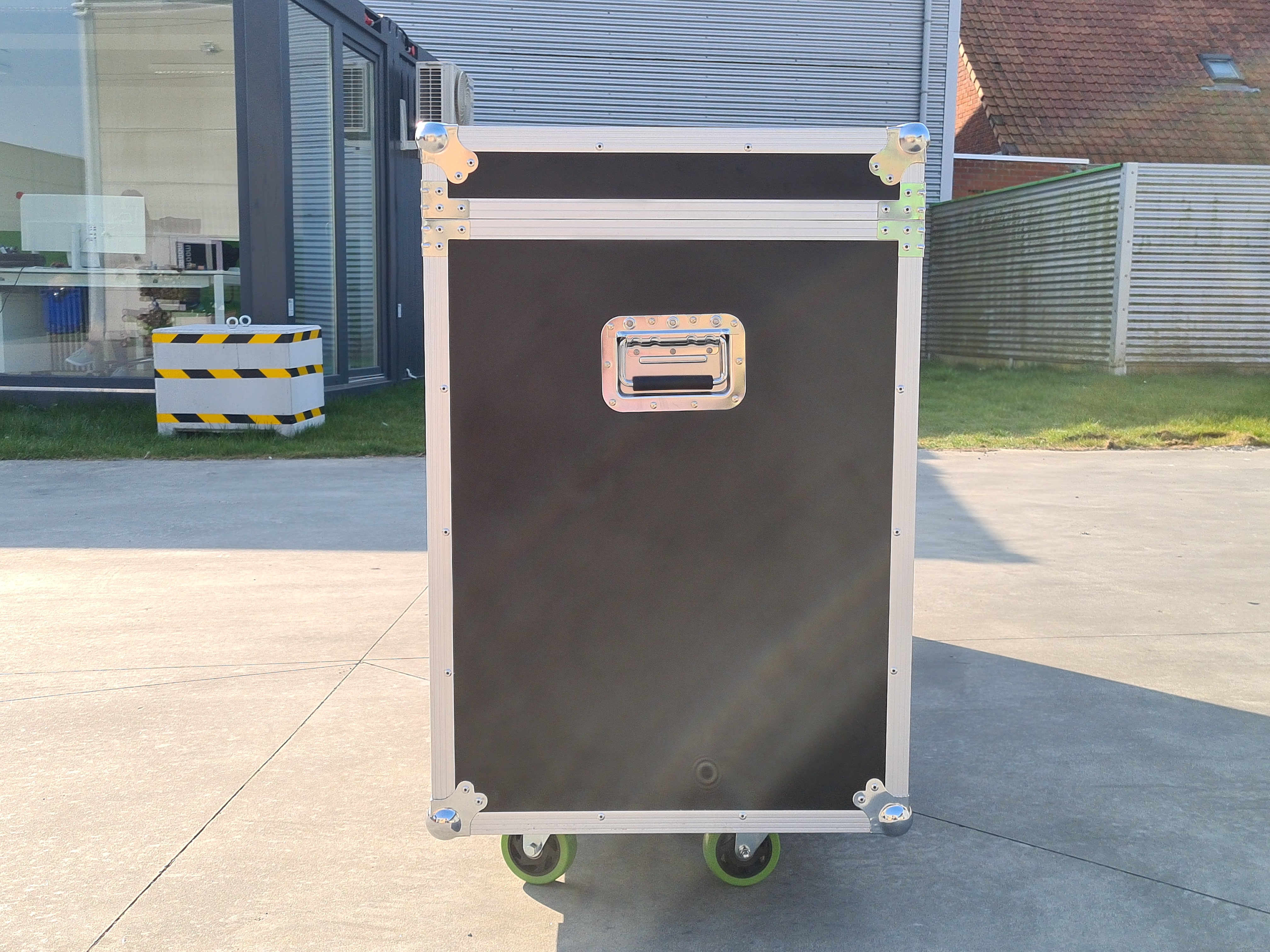 This flight case (extra large) is ideal for storing a Flexxum folding tent (4 x 4 m, 4 x 6 m, 4 x 8 m). The box consists of a combination of 10 mm thick fire-retardant laminated plywood and 2 mm thick high-quality aluminium. The hinges and butterfly catches are made of chromium-plated metal.