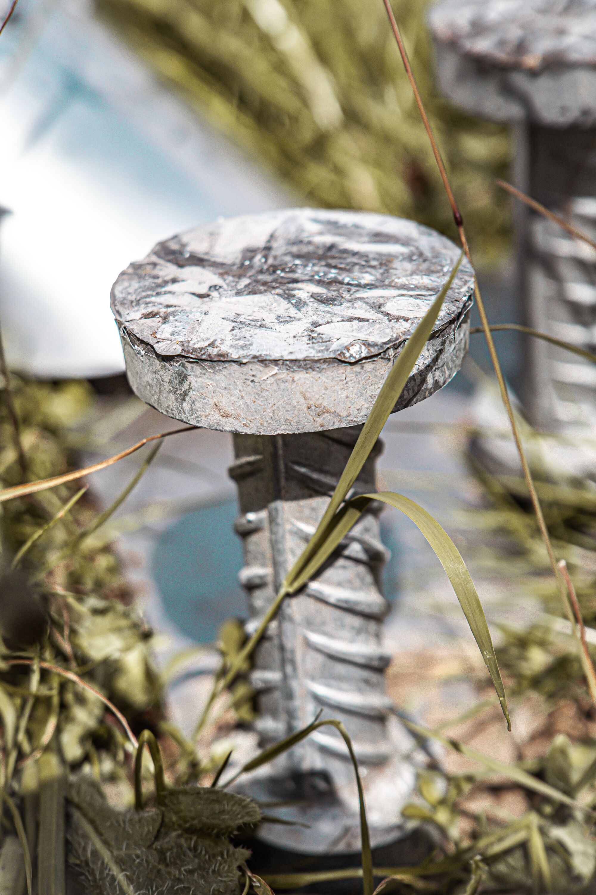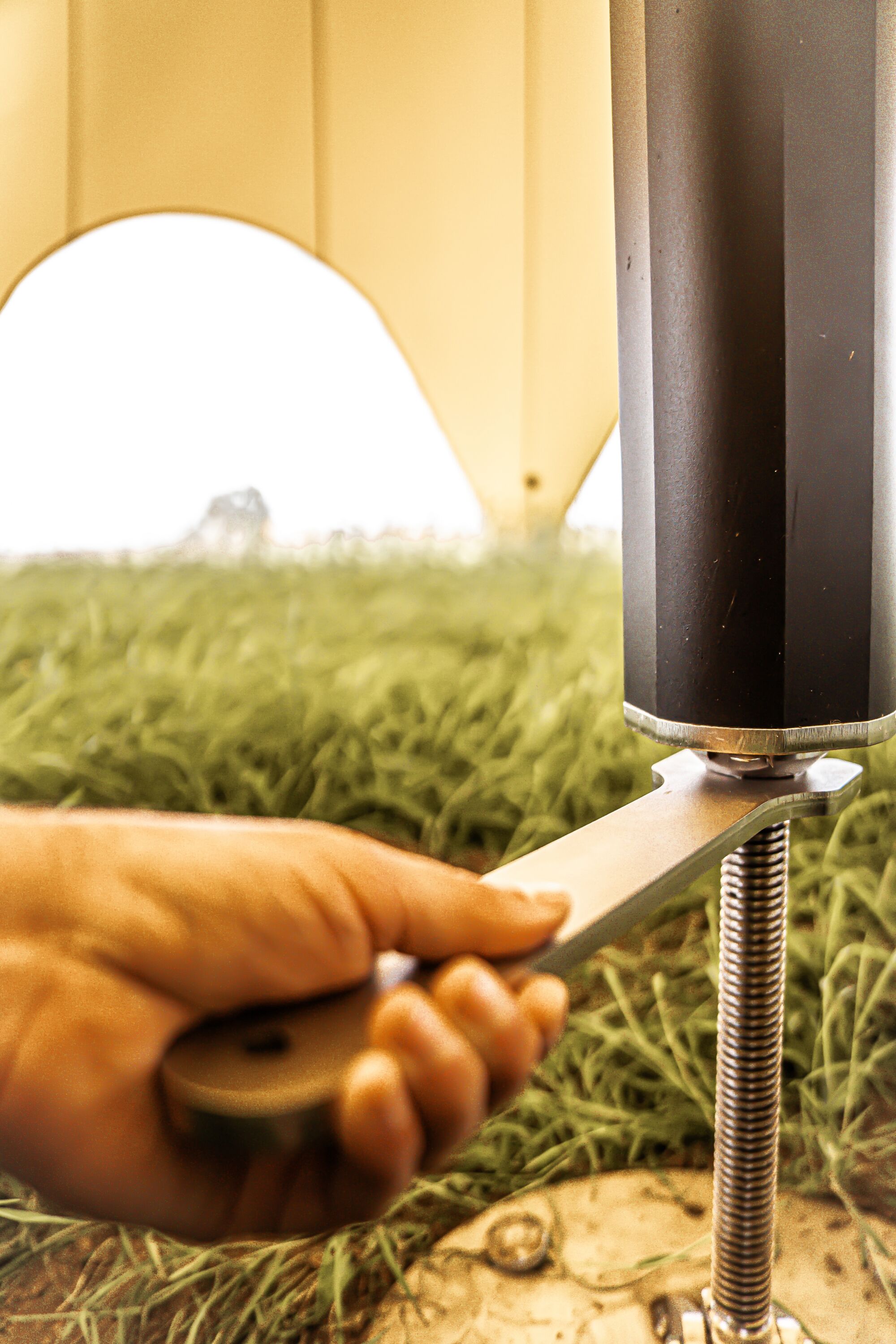 Since there are several ways to anchor the star tent, no anchoring is provided as standard with the tent. On soft ground, you can anchor the tent using a stainless steel anchoring plate per leg and tent pegs. On hard ground, such as concrete, asphalt, or a terrace, you can place a concrete block on a special plate with an attachment point to which the hoof-shaped end of the tent leg is hooked.