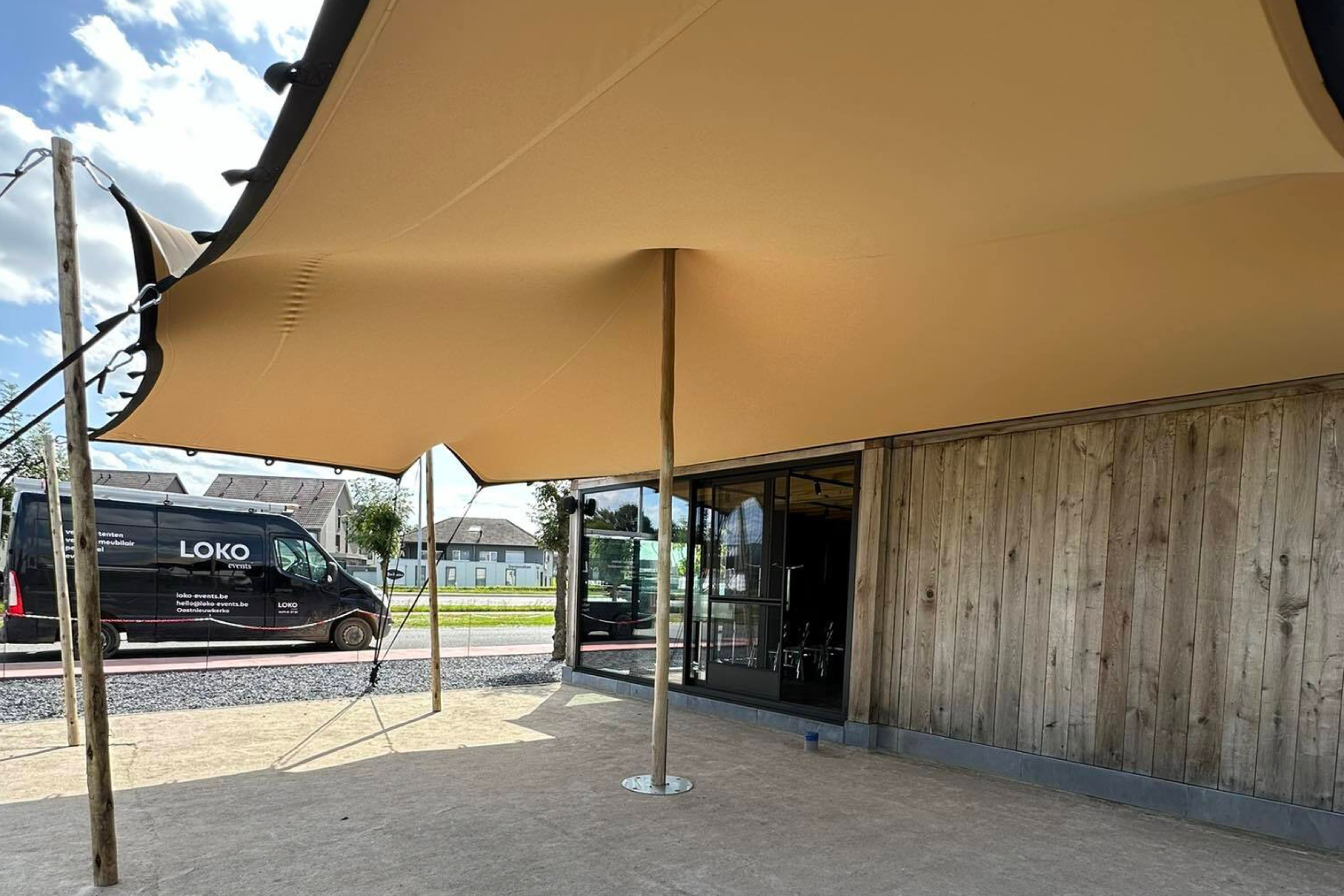 Discover the versatility and stylish charm of our professional stretch tents! Whether you have an outdoor event, party, summer bar, patio or garden, our stretch tents, also known as nomad tents, offer the perfect solution to transform your space and create an unforgettable atmosphere. With their unique design, high-quality materials and customizable setups, our stretch tents are the ideal choice for any occasion. Whether you want to enjoy an open and airy setting in nice weather, need shelter from wind or create a cozy shelter during a rainstorm, our stretch tents effortlessly adapt to your needs through our movable wooden and aluminum poles. Be inspired by the endless possibilities and make your event an unforgettable experience with our versatile stretch tents.