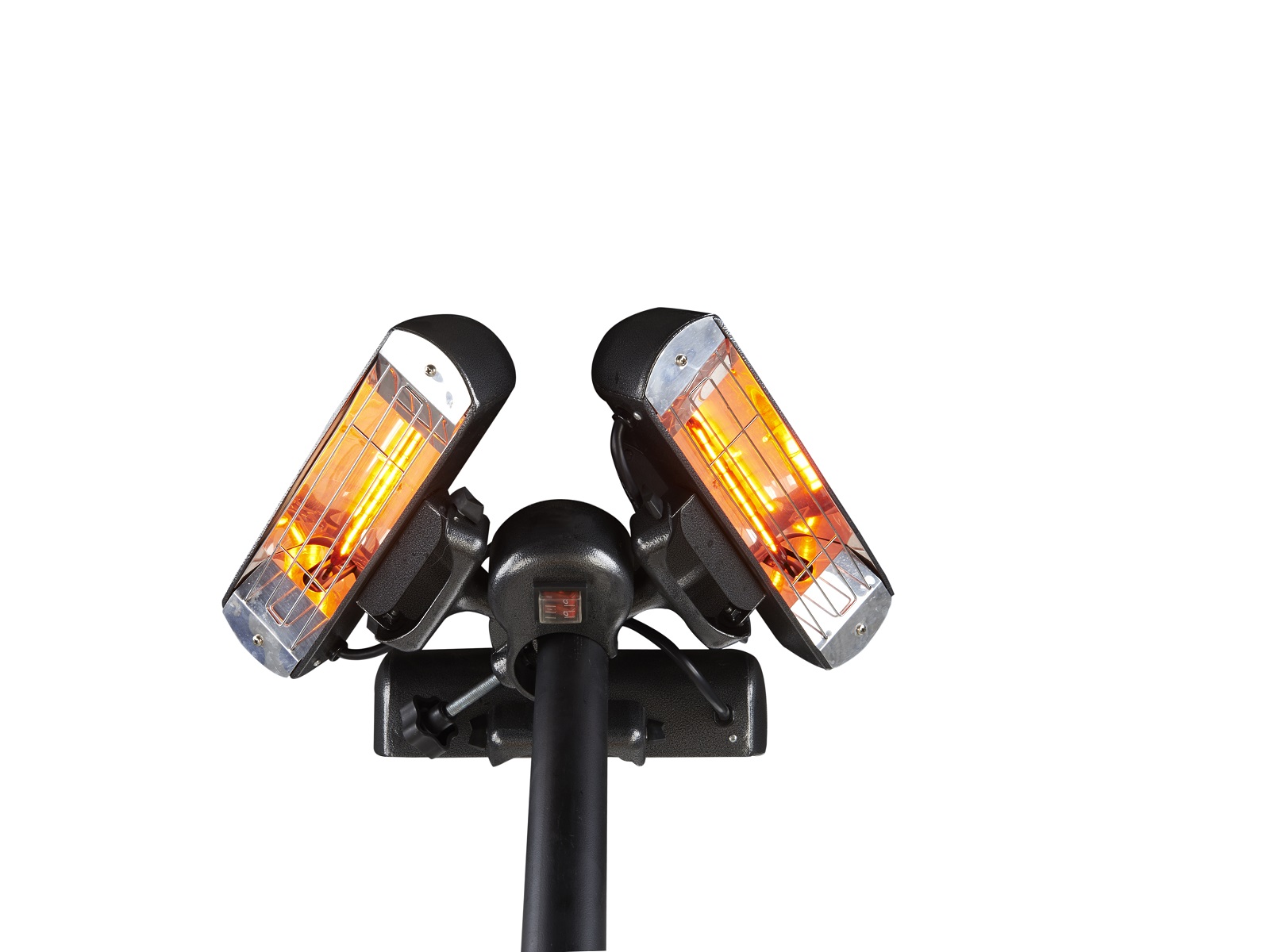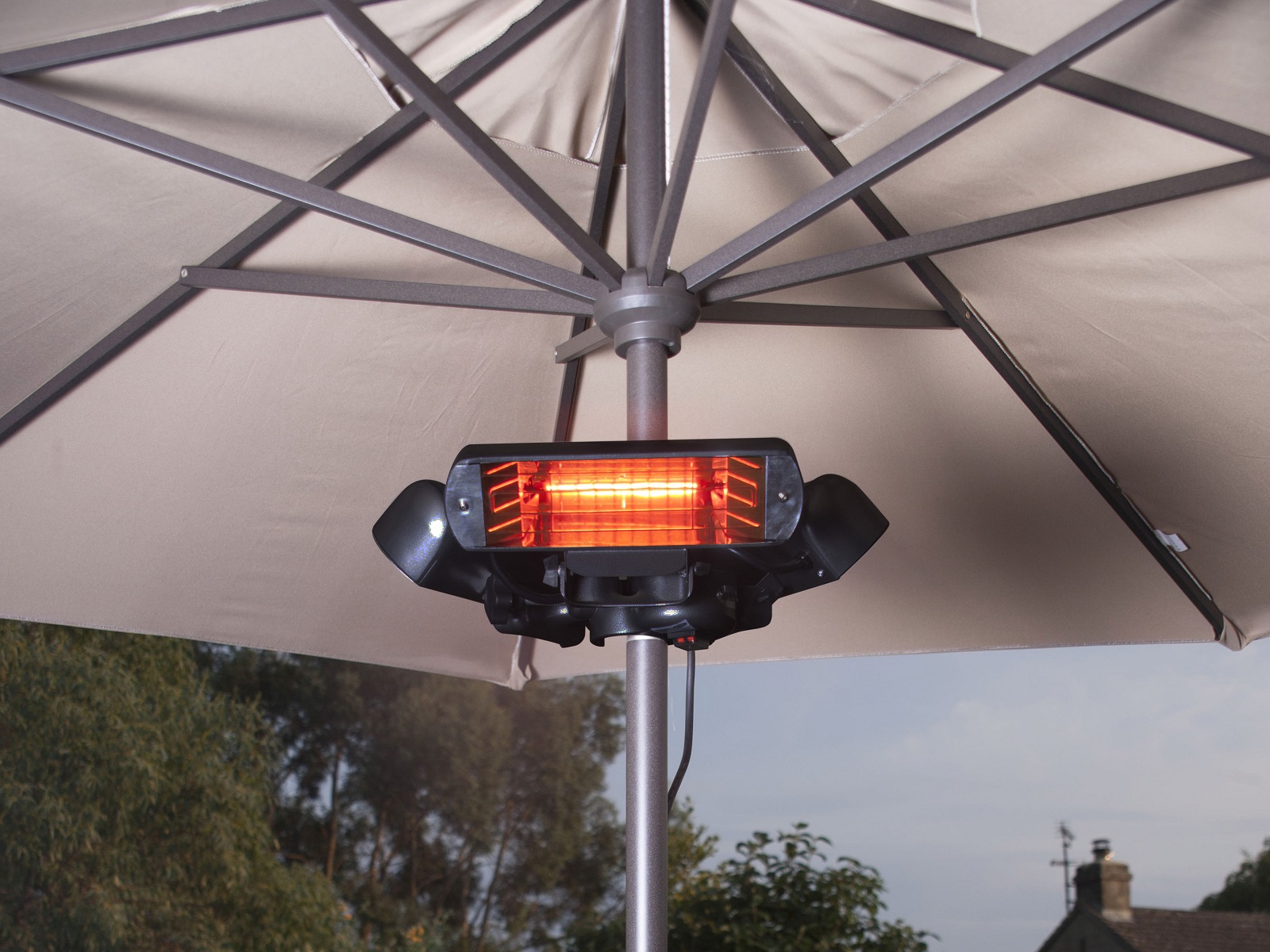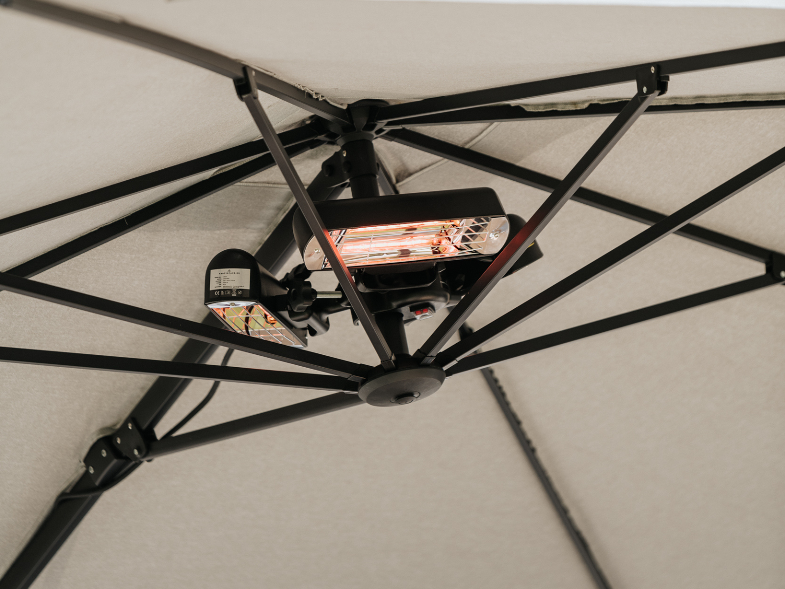 With our Sunbeam 2400 patio heater you easily eliminate all chilliness from under your tent or parasol. Yes, indeed: you can not only use this device under a sunshade, but also in a folding tent. Just put the 5 cm wide opening of the Sunbeam around the mast of your sunshade or tent and tighten the screw. Easy, right? And with three heating heads of 800 Watt each, that are nicely integrated in a steel casing with a waterproof finishing, you can even enjoy the chilliest evenings. It’s completely up to you how many heating elements you switch on.