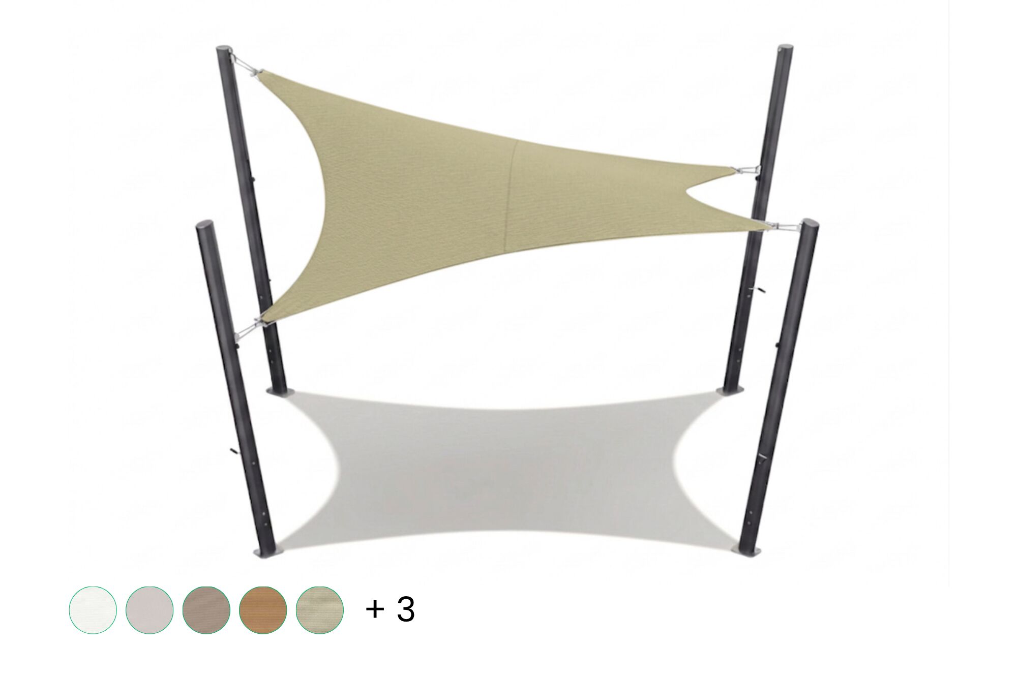 The shade sail can be installed using wall fixations, aluminium poles, wooden poles, or a combination of these. Please note that a tensioning system is not included as standard, so additional hardware may be required to ensure proper and safe installation.