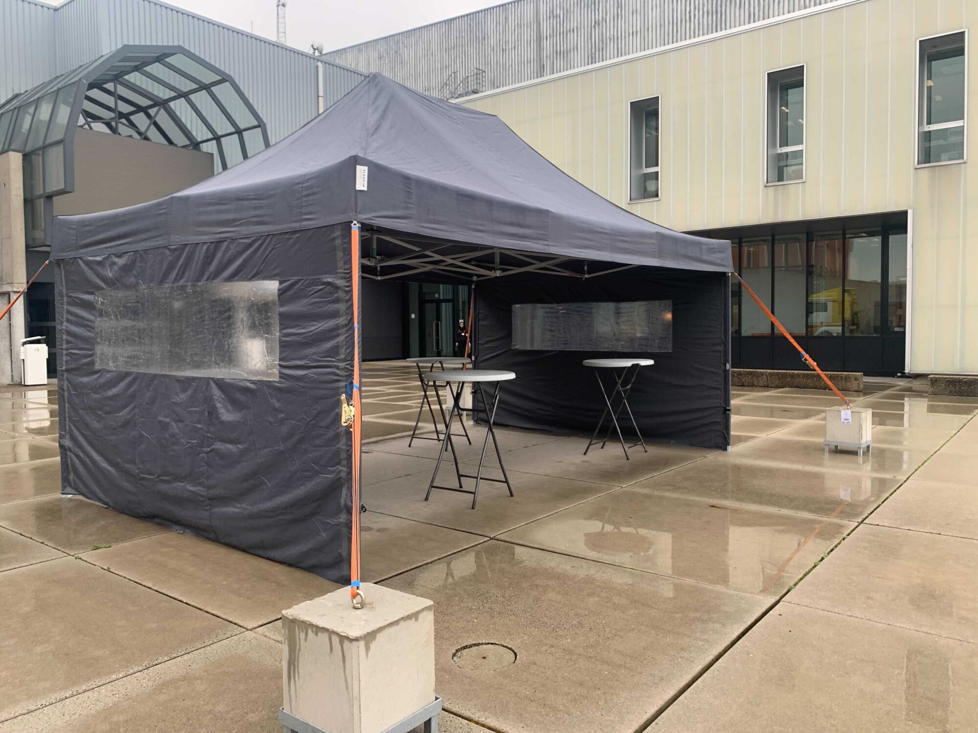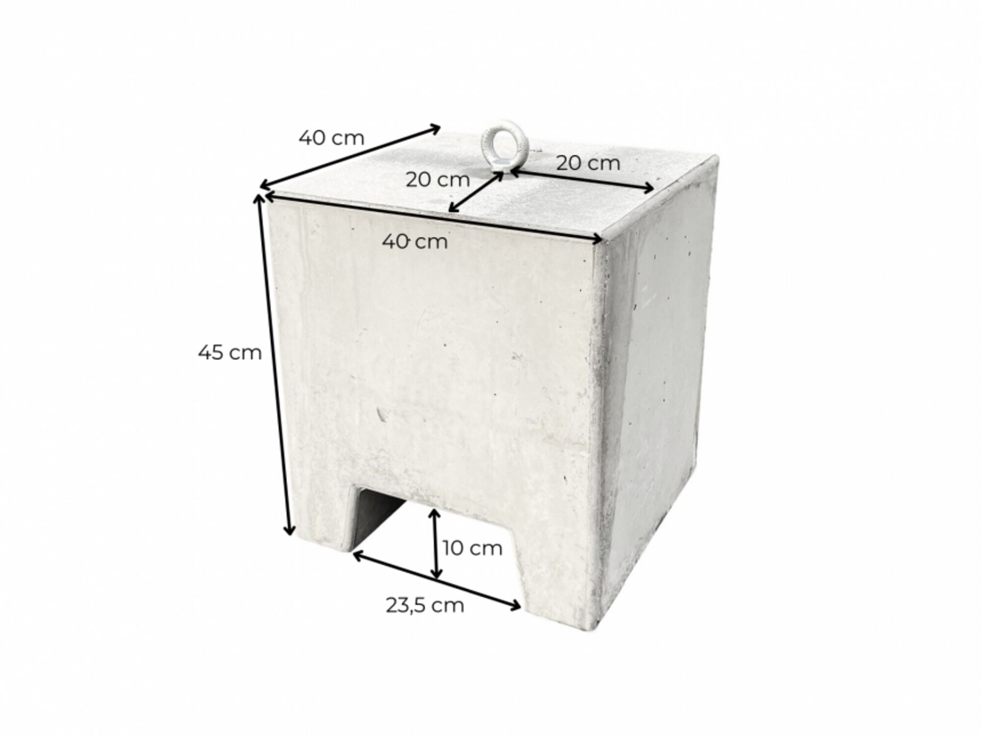 Le bloc de béton de 145 kg est parfait pour arrimer les tentes aux surfaces dures en toute sécurité. Les blocs de béton ont une ouverture de 23 cm de large dans le fond pour permettre un transport plus facile avec une transpalette ou un chariot élévateur. Un boulon à oeil (M16) est vissé sur le dessus du poids du béton que vous pouvez par exemple utiliser pour fixer les courroies d’orage. Le bloc mesure 40 x 40 cm et mesure 45 cm de hauteur (sans le boulon à œil).