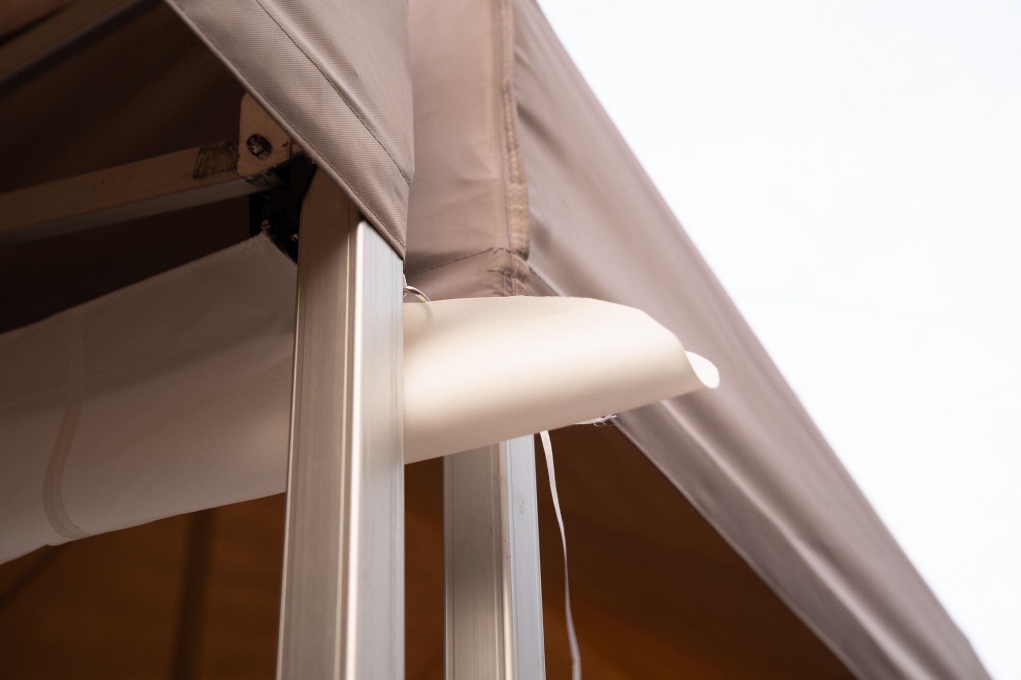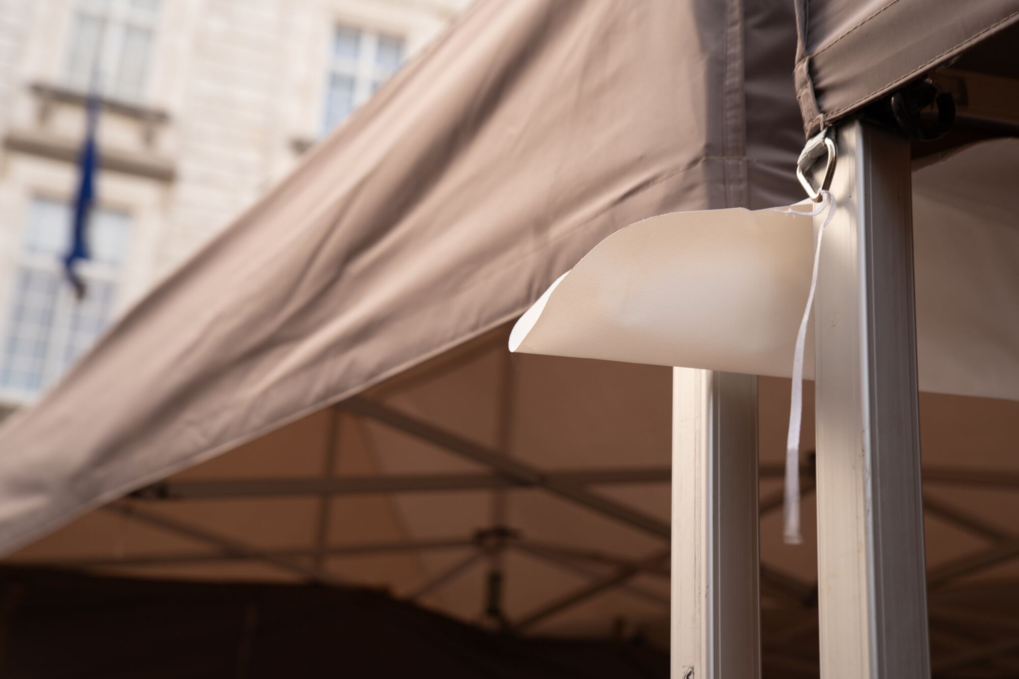 Cette gouttière en PVC doit être installée entre deux tonnelles pliantes juxtaposées qui ont chacune un côté de 4 m. La gouttière est fixée à l'intérieur des voiles du toit avec du velcro du début jusqu’au bout, ce qui assure une installation facile et absolument imperméable. En outre, les gouttières sont légèrement plus longues que la tente elle-même. Ainsi on évite que l’eau coule tout au long des parois.