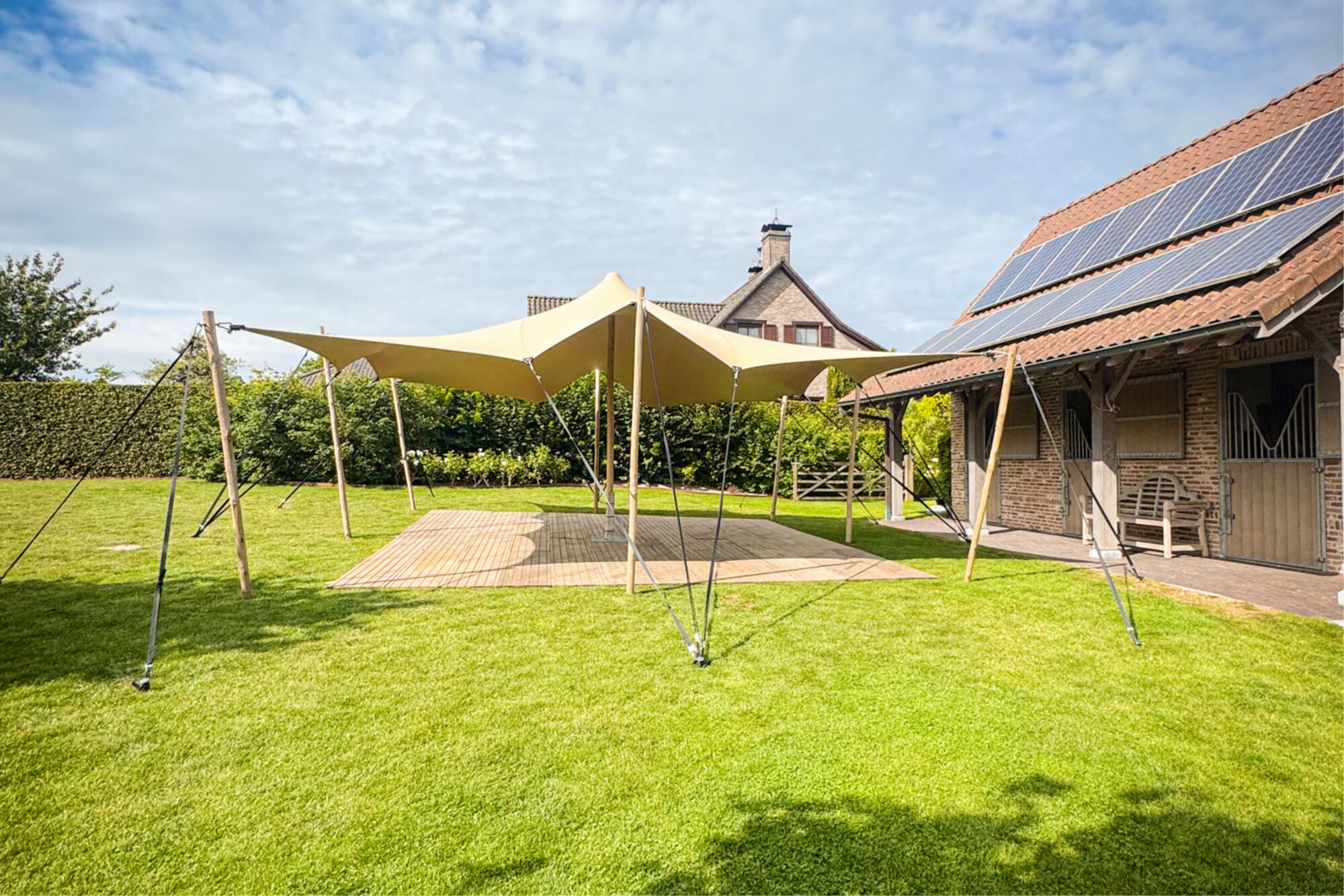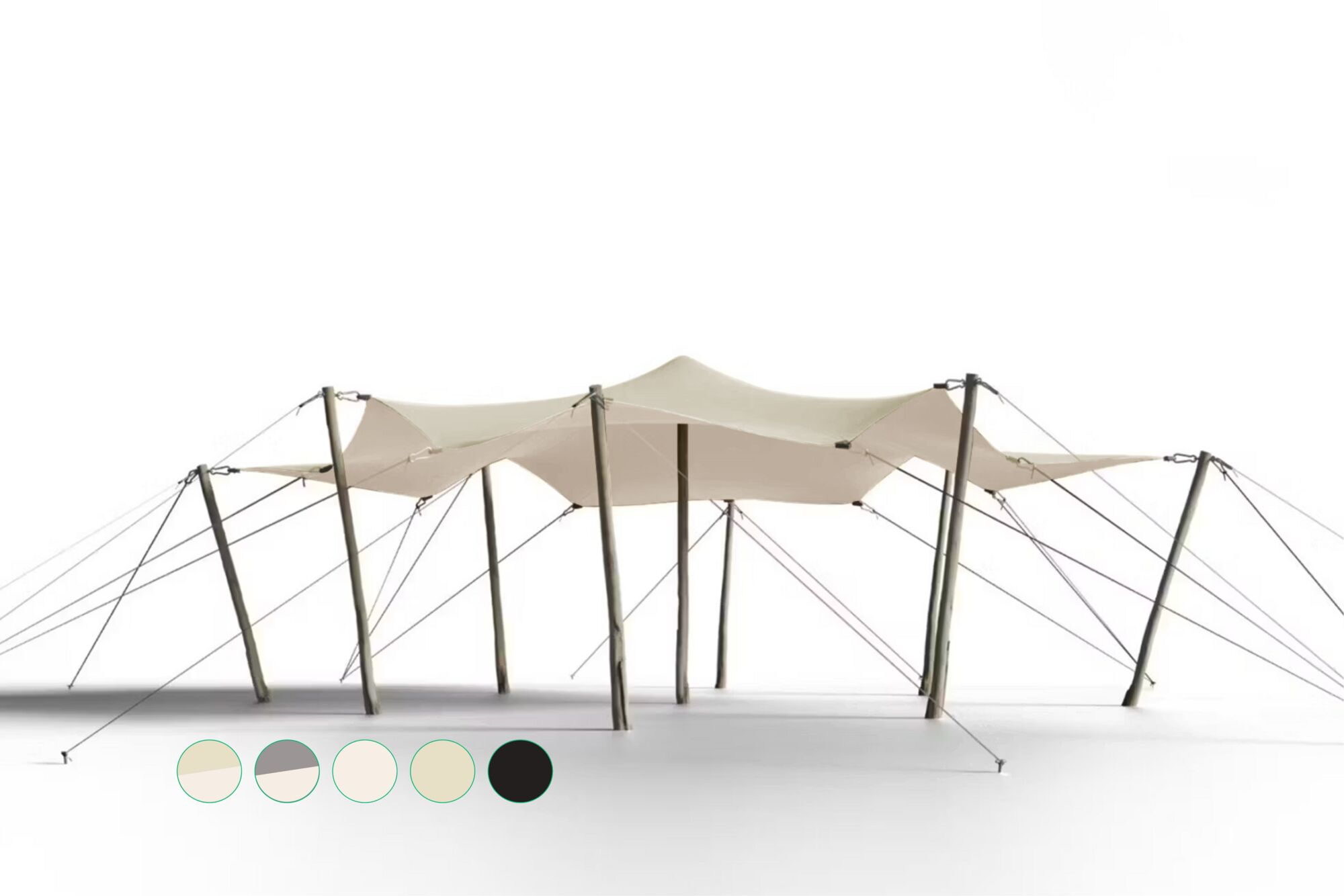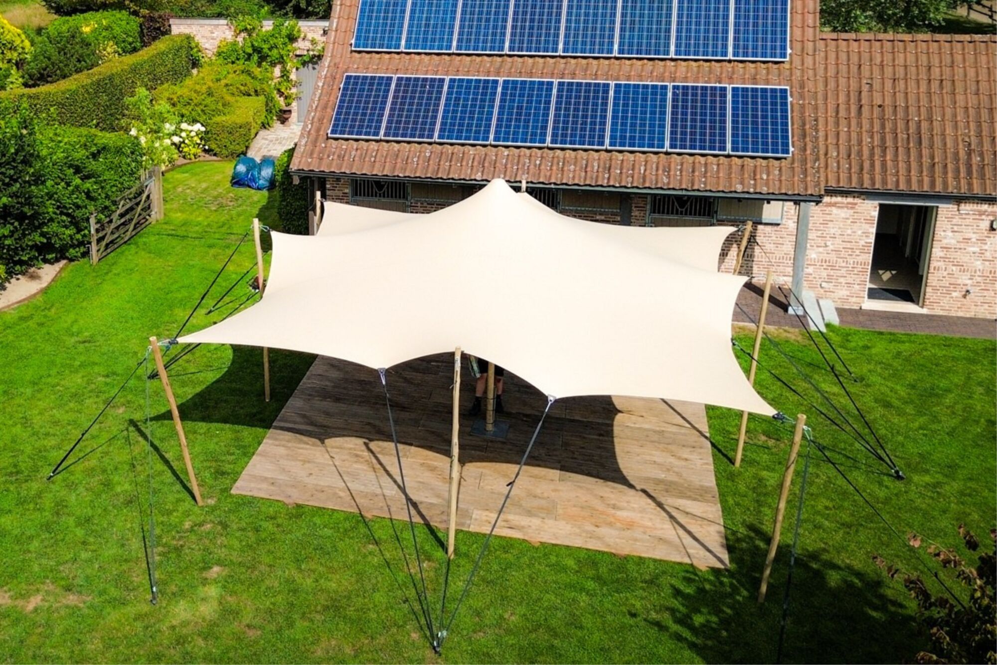Notre tente stretch à revêtement double de 6,5 par 6,5 m, également appelée tente nomade, donnera sans aucun doute une touche estivale et méridionale à votre événement, fête, bar d’été, terrasse ou jardin. Vous êtes très libre dans la configuration de la tente grâce à la voile élastique et aux poteaux amovibles en aluminium ou en bois d’eucalyptus ultra robuste (les ensembles de poteaux sont disponibles séparément). Par beau temps, vous pouvez installer la tente avec les quatre côtés ouverts. Fermez un ou plusieurs côtés quand il y a du vent ou même les quatre côtés par temps de pluie. Plus votre tente sera grande, plus il y aura de possibilités. Une fois que la tente est complètement installée, il reste toujours la possibilité de faire des petits ajustements : créer un passage supplémentaire pendant l’événement, repositionner un poteau qui bloque l’entrée….etc.