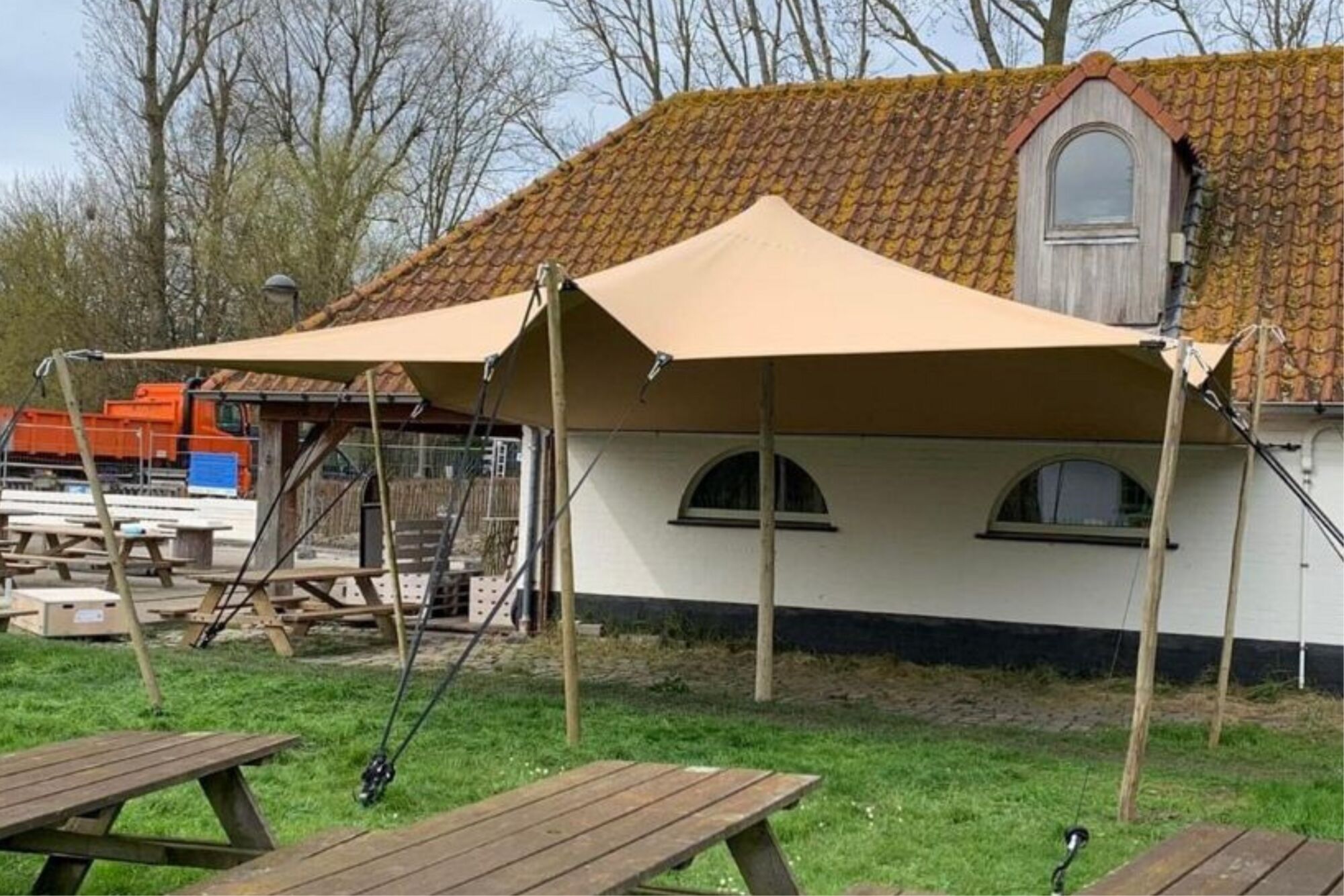 Car nous voulons offrir une solution personalisée à chacun(e) de nos clients, nous vous laissons choiser vos poteaux, piquets et tendeurs vous-même. Par suite les poteaux, les piquets et les tendeurs ne son PAS compris avec la tente et vous devez encore les acheter en plus.