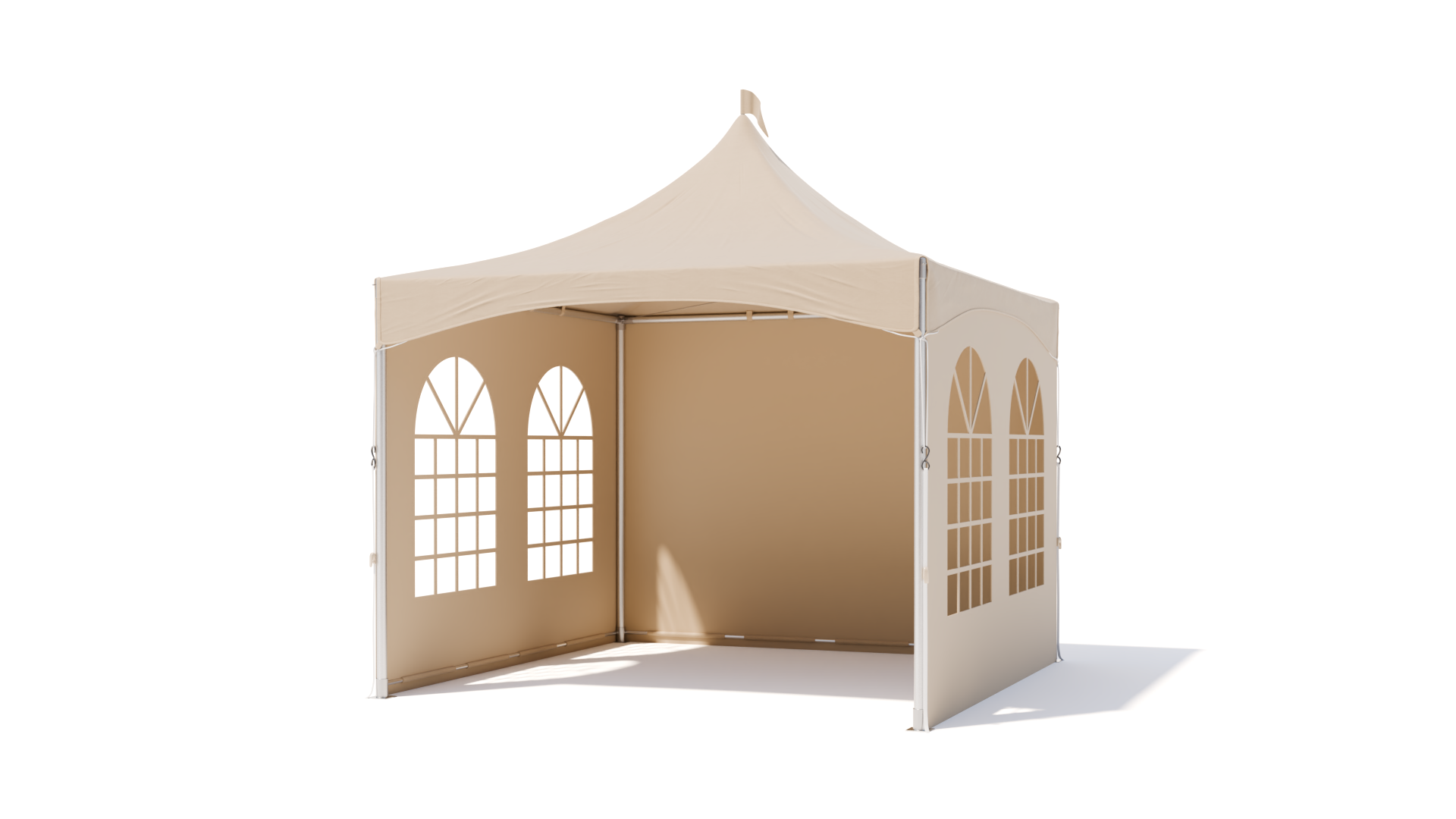 Het kader van de pagodetent bestaat uit krasvrij geanodiseerde aluminiumbuizen met een diameter van 63,5 mm en een wanddikte van 3 mm. Bij Above & Beyond bieden we u de kederversie aan: in de aluminiumprofielen werden gleuven aangebracht, waarin de meegeleverde zijwanden glijden. Geen lelijke, vervelende lussen meer! De zijwanden schuiven in de buizen en zorgen voor een stevige en strakke stijlvolle pagode. Bovendien is de tent zo volledig winddicht.