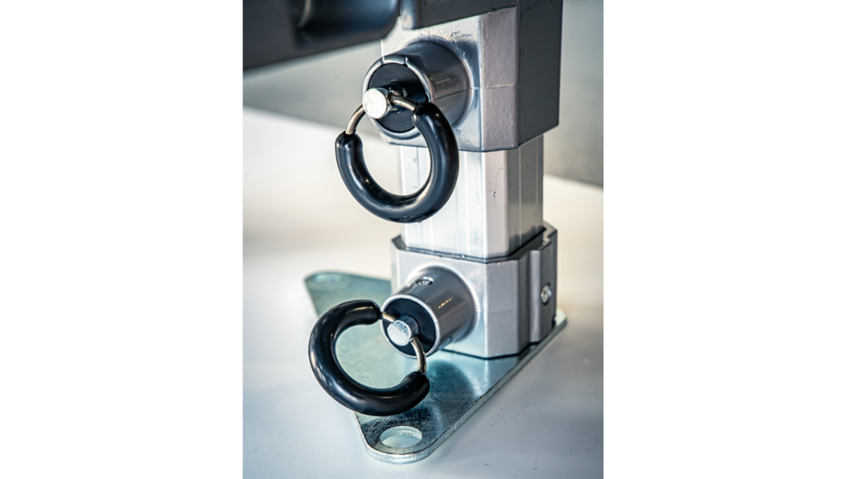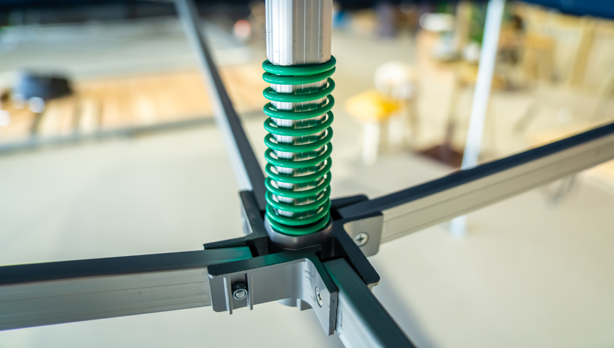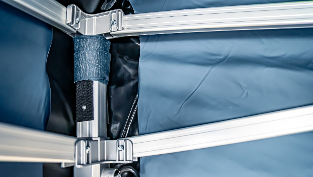 - Groene springveer in dakframe: houdt het dak op spanning en vangt schokken op bij zwaardere weersomstandigheden