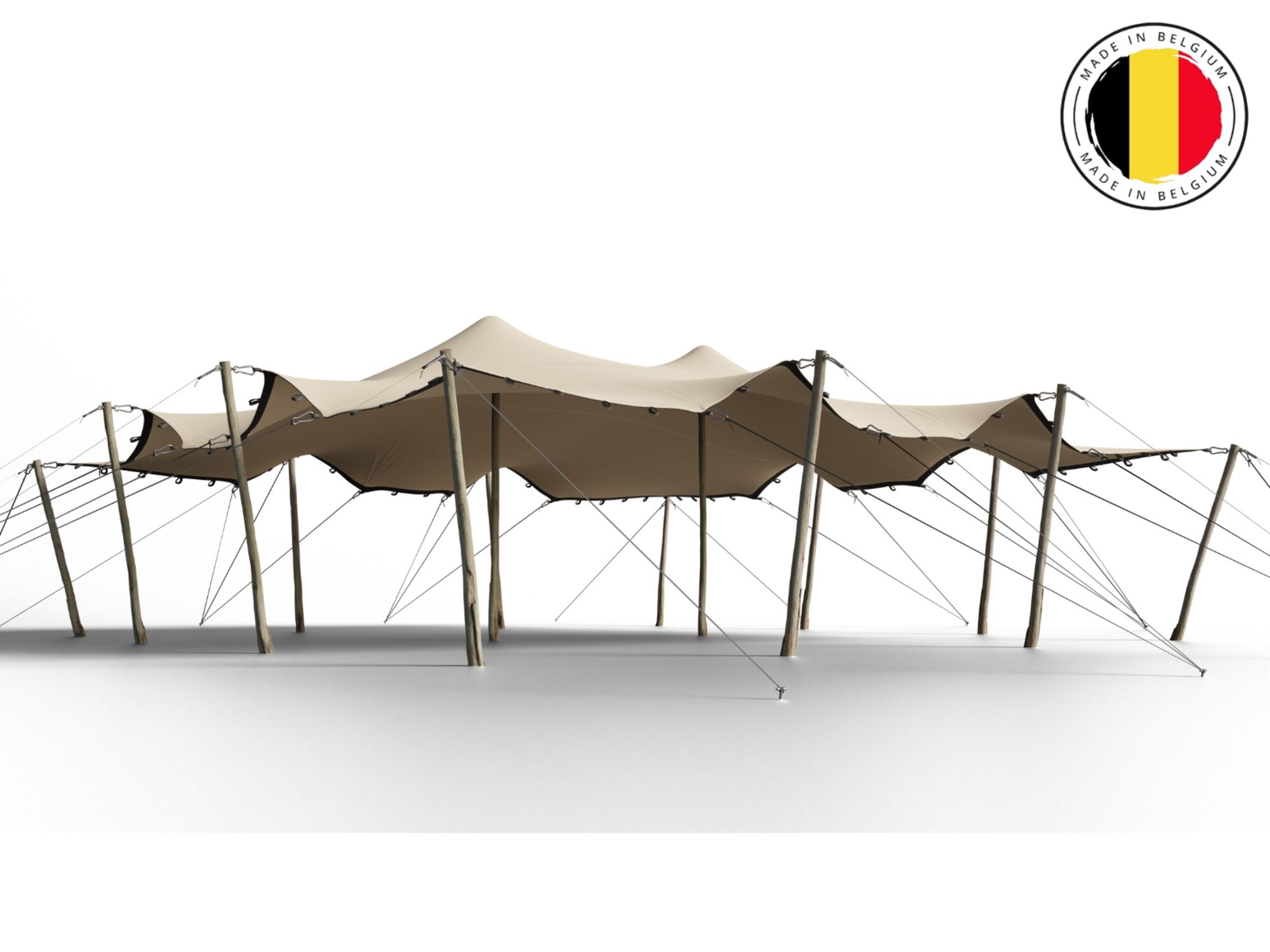 Geef je evenement, feestje, zomerbar, terras of tuin een zomerse en zuiderse toets met onze double coated stretchtent van 10 x 10,5 m, ook wel nomadentent genoemd. Dankzij het elastische zeil en de verplaatsbare palen uit aluminium of ultra stevig eucalyptushout (palensets zijn apart aan te kopen) kan je spelen met de opstelling van de tent: bij mooi weer stel je de tent op met vier open zijdes, bij wind met een of meerdere gesloten zijden en bij regen kan je de tent bijna helemaal gesloten opstellen. Hoe groter je tent, hoe meer mogelijkheden. Wil je tijdens het evenement een extra doorgang creëren of staat er een zij- of hoekpaal in de weg? Dan kan je kleine aanpassingen aan de opstelling bovendien eenvoudigweg uitvoeren terwijl de tent opgesteld staat.