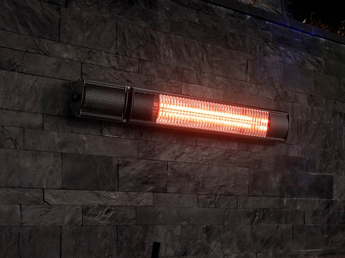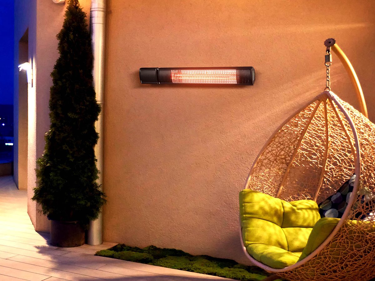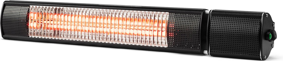 Deze wandheater is voorzien van golden tube infrarood halogeen lampen met een levensduur van 5000 tot 7000 uur. De behuizing van de verwarmer bestaat uit zwart gepoedercoat staal. Het toestel kreeg een IP-certificering van 65 d.w.z. dat het stof- en waterbestendig is. Deze infrarood terrasverwarmer kan dus zeker een regenbui verdragen en is daardoor helemaal outdoor proof. Alle accessoires (schroeven, beugels en ketting) om de wandheater op te hangen zijn inbegrepen.